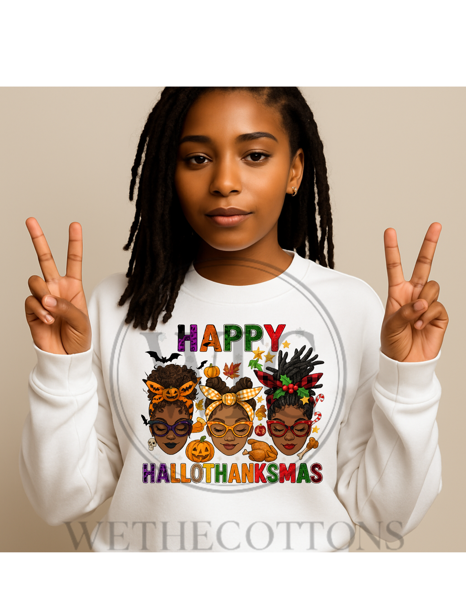 Celebrate all your favorite holidays in one with the HalloThanksmas Holiday Graphic Unisex T-Shirt and Sweater! This festive 3-in-1 design blends the spooky vibes of Halloween, the cozy warmth of Thanksgiving, and the cheerful spirit of Christmas into one colorful graphic tee or sweater.